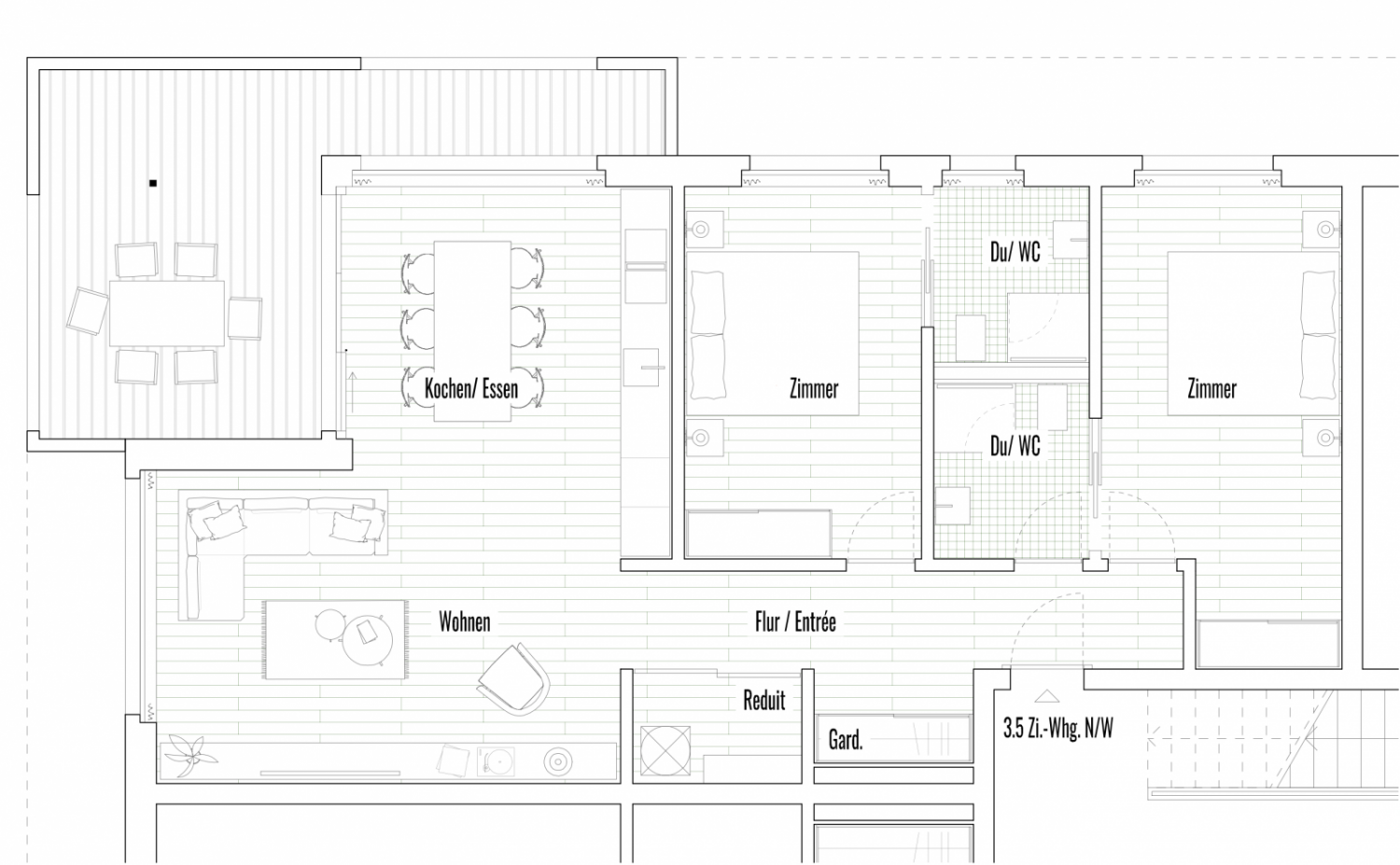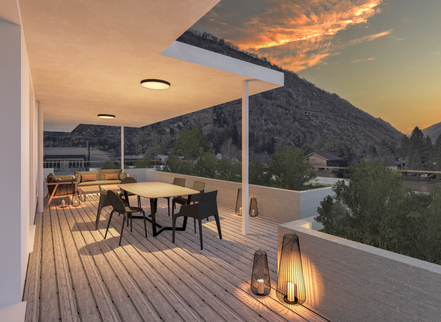 Attika-Terrasse beim gedeckten Sitzplatz Teilverglasung (Windschutz) möglich gg. Aufpreis.
