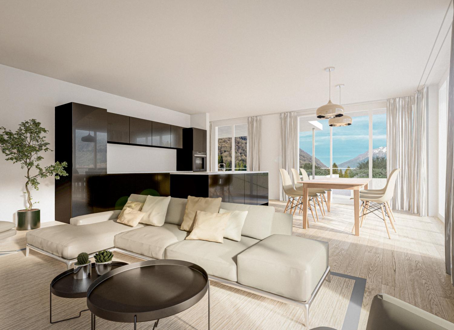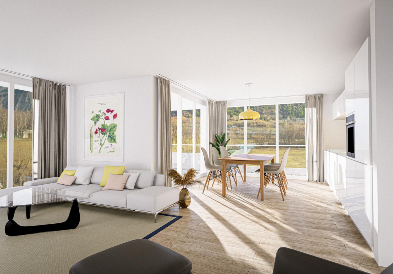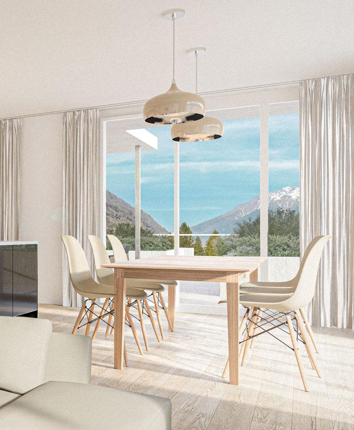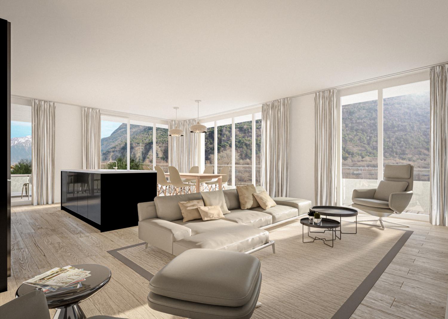 Der Wohn- und Essraum, mit seinen grossen Fensterfronten und Balkon, garantiert Ihnen eine fantastische Aussicht: im Sommer auf die grünen Wiesen, im Winter auf die verschneite Walliser Bergwelt.