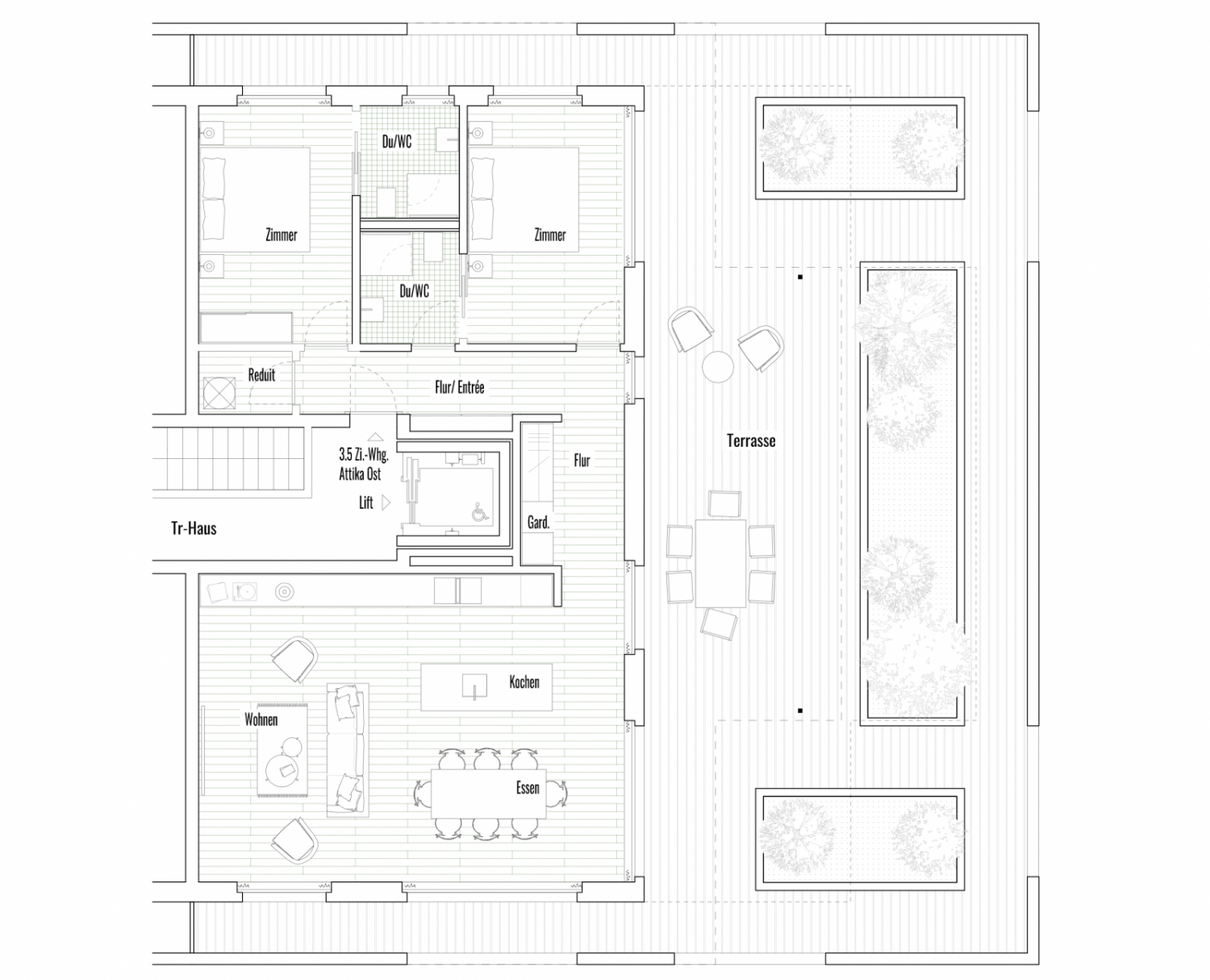Entlüftung der innenliegenden Nasszellen und Reduits mit Abluft über Dach. Küchenabluft mittels Umluftabzug mit Aktivkohlefilter.